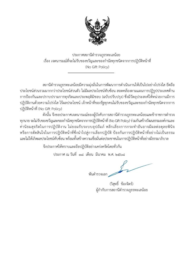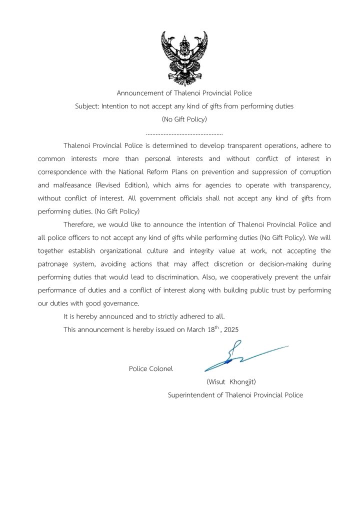 - ประกาศสำนักงานยุทธศาสตร์ตำรวจเรื่องเจตนารมณ์ที่จะไม่รับของขวัญหรือของกำนัลทุกชนิดจากการปฏิบัติหน้าที่