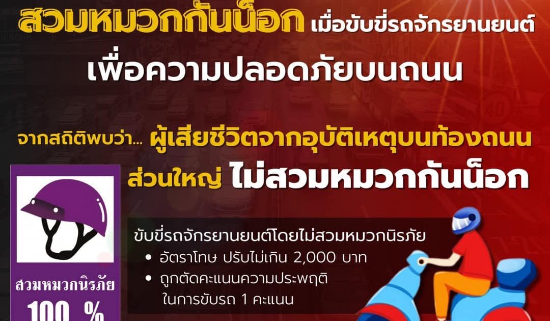 จากสถิติอุบัติเหตุทางถนนของระบบฐานข้อมูลอุบัติเหตุทางถนน ( PRS ) สำนักงานตำรวจแห่งชาติ พบว่าผู้เสียชีวิตที่ไม่สวมหมวกนิรภัย หรือหมวกกันน็อกมีสัดส่วนสูงกว่าผู้ที่สวมหมวกนิรภัยอย่างชัดเจน จึงขอให้ผู้ขับขี่ทุกคนคำนึงถึงความปลอดภัย