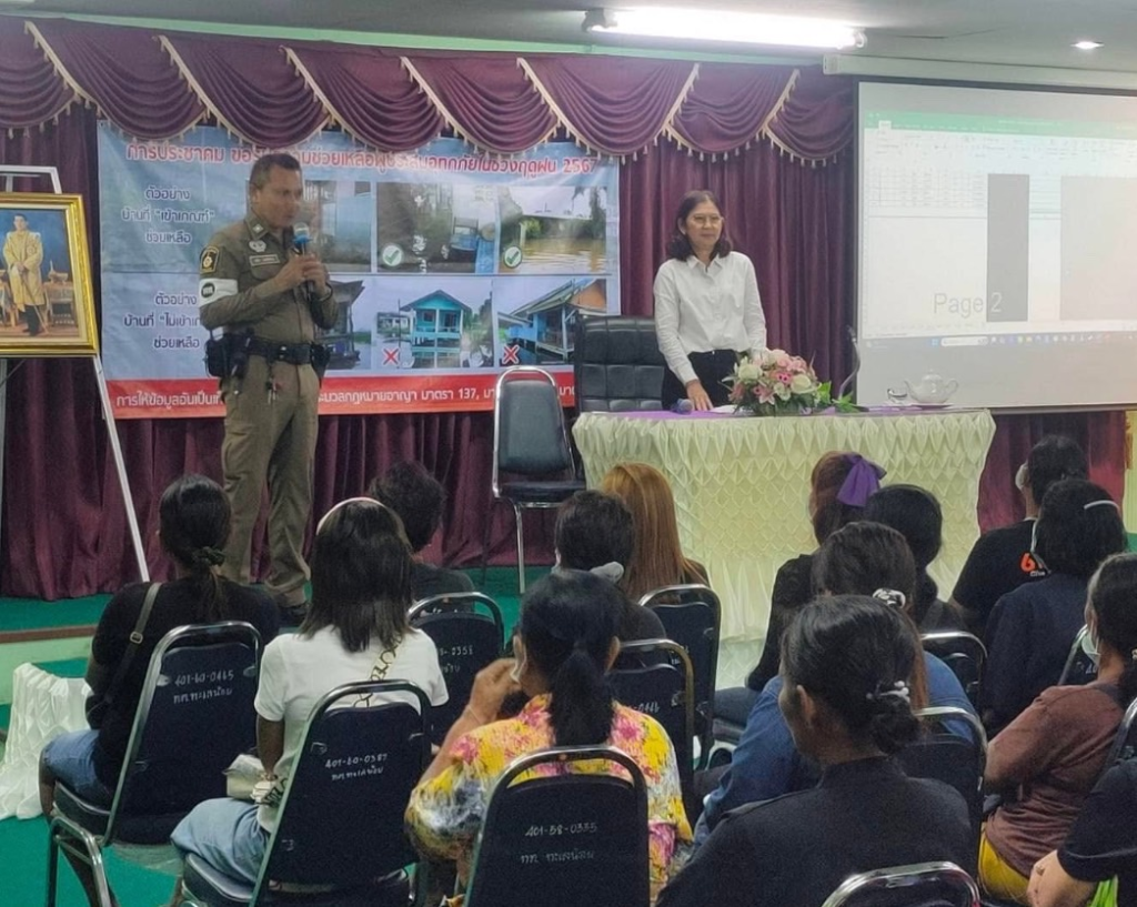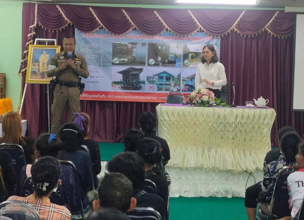 นางชลฑิชา หมื่นหนู นายกเทศมนตรีตำบลทะเลน้อย/รองประธาน กต.ตร.สภ.ทะเลน้อย, ร.ต.ต.ถวิล พงศาปาน รอง สว.(ป.) สายตรวจจราจร/ครูตำรวจแดร์/ชมส./1 ตร.1 ร.ร/., ด.ต.รุ่งโรจน์ จันทรมาศ สายตรวจตราจร วิทยากรโครงการการประชาคมขอรับความช่วยเหลือผู้ประสบอุทกภัยในช่วงฤดูฝน 2567