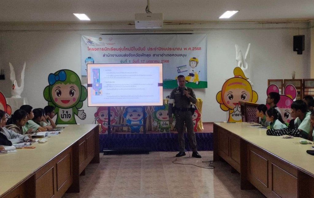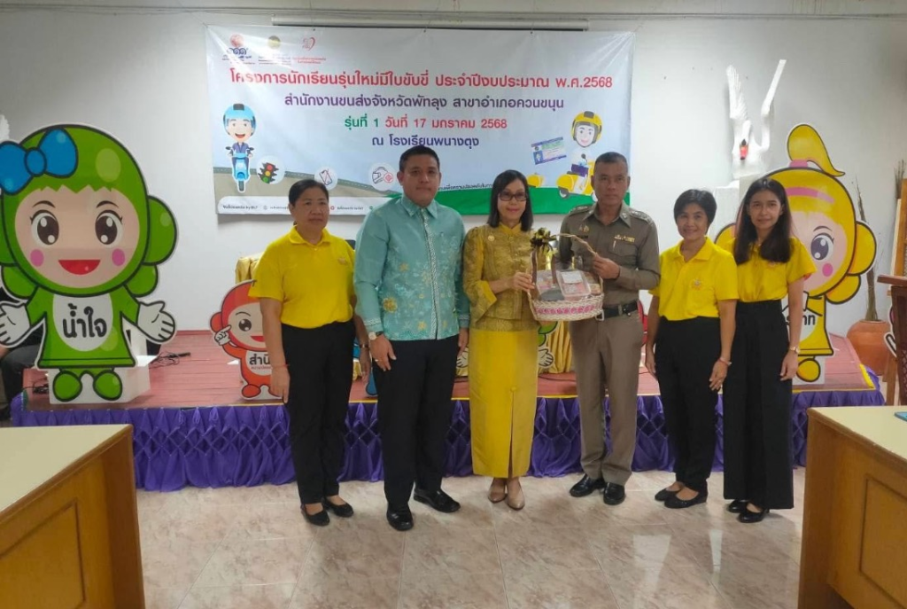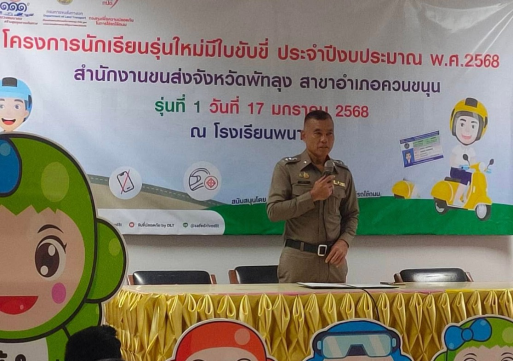 วันที่ 17 มกราคม 2568 เวลา 08.30 น. พ.ต.อ.เฉลิม ยิ่งคง ผกก.(สอบสวน)ภ.จว.พัทลุง รรท.ผกก.สภ.ทะเลน้อย/กรรมการ กต.ตร.สภ.ทะเลน้อย เป็นประธานในพิธีเปิด นายสันติ แสงทอง ประธาน กต.ตร.สภ.ทะเลน้อย โครงการนักเรียนรุ่นใหม่มีใบขับขี่ ประจำปีงบประมาณ พ.ศ.2568 สำนักงานขนส่งจังหวัดพัทลุง สาขาอำเภอควนขนุน พร้อมด้วย ร.ต.ต.ถวิล พงศาปาน รอง สว.(ป) สภ.ทะเลน้อย ร่วมบรรยายให้ความรู้ทางกฎหมายพรบ.จราจร พร้อมประชาสัมพันธ์สื่อออนไลน์กลโกง ณ โรงเรียนพนางตุง ต.พนางตุง อ.ควนขนุน จ.พัทลุง