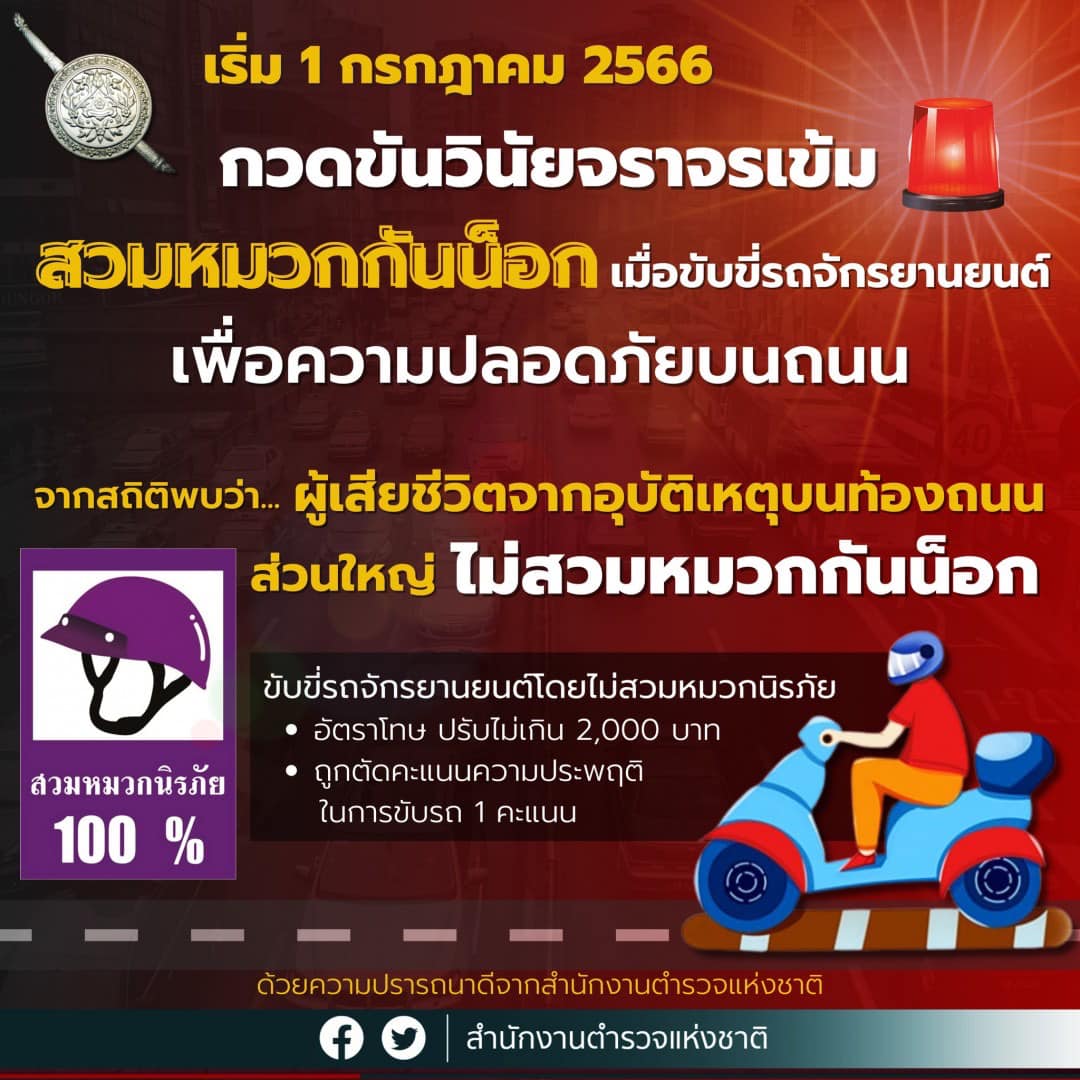 เริ่ม 1 กรกฎาคม 2566 🚨🚨กวดขันวินัยจราจรเข้ม .. สวมหมวกกันน็อกทุกครั้งเมื่อขับขี่ หรือ นั่งซ้อนรถจักร