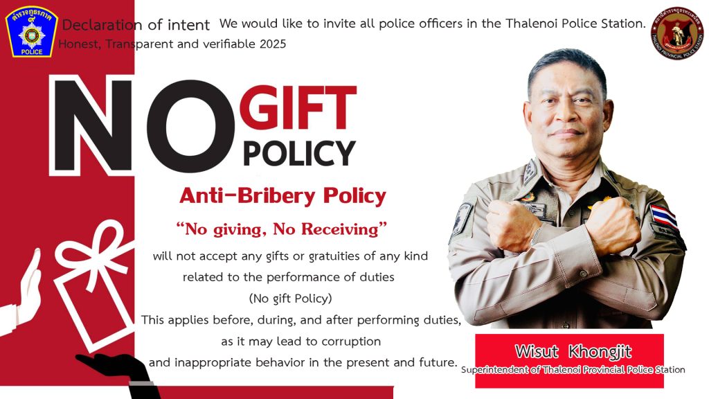 เรื่อง เจตนารมณ์ที่จะไม่รับของขวัญและของกำนัลทุกชนิดจากการปฏิบัติหน้าที่ (No Gift Policy)